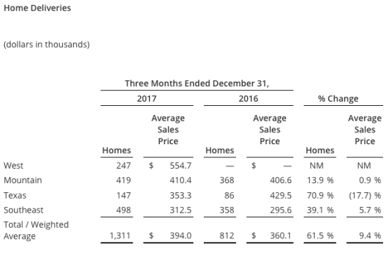 Deliveries and average sales price of home deliveries in the fourth quarter of 2017 were both favorably impacted, primarily in the West, by the acquisitions of UCP and Sundquist. Excluding the West, the company’s legacy regions experienced growth in revenue and deliveries of 22% and 31%, respectively.