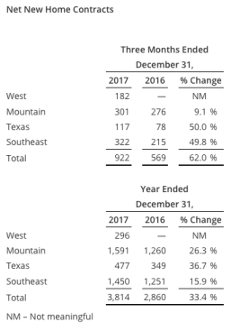 Net new home contracts in the fourth quarter 2017 increased to 922 homes, representing an increase of 62%, compared to 569 homes in the prior year quarter, attributable to the addition of the new West region and stronger demand trends in all legacy regions driving an overall increase in absorption rates. Excluding the West, the company’s legacy regions experienced a 30% increase in net new home contracts.