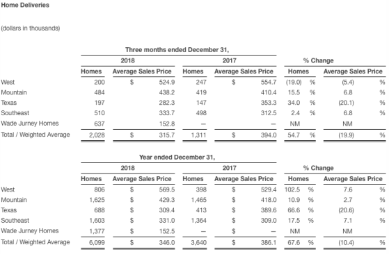 Rob Francescon, co-CEO, said, “During 2018, we grew our business into a top-10 U.S. home builder through strategic positioning in attractive markets, broader product offerings and sound investments with a focus on lower price points. Additionally, we made significant progress in the ramp up of our Financial Services business, with that segment growing full year pre-tax income over six times. While we are encouraged by our progress and positive long-term housing fundamentals in our markets, demand may remain muted in 2019 due to a variety of macro factors, including higher mortgage rates and tightening affordability. In response, we plan to continue to tailor our product offerings according to evolving demand trends, expand our Wade Jurney Homes’ brand and drive operational efficiencies.”