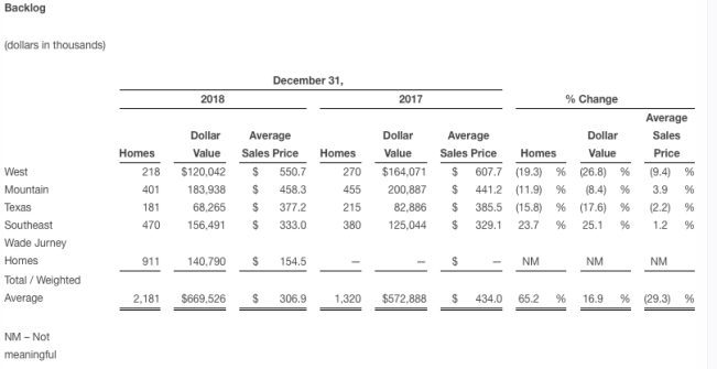 Net new home contracts in the fourth quarter 2018 increased 32% to 1,221 homes, compared to 922 homes in the prior year quarter, attributable to stronger demand trends within the Texas Region and the benefit of our Wade Jurney Homes acquisition, partly offset by softer demand trends in the company’s other regions. At the end of the fourth quarter 2018, the company had 2,181 homes in backlog, representing $669.5 million of backlog dollar value, compared to 1,320 homes in backlog, representing $572.9 million of backlog dollar value in the prior year quarter, an increase of 65% in units and 17% in dollar value.