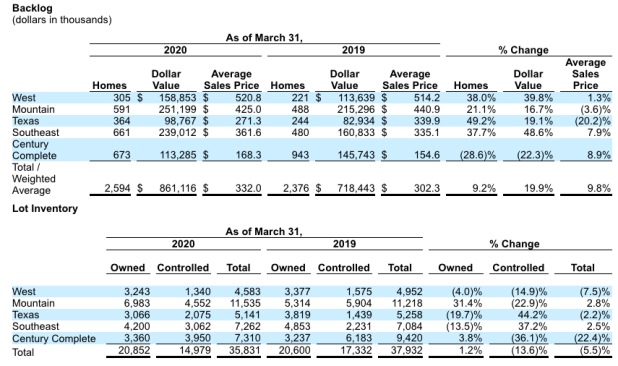 Rob Francescon, co-CEO, said, “Our team has taken extraordinary steps and displayed impressive ingenuity to enable Century to build, sell and close homes on a daily basis across our national footprint. Although the full impact of the virus remains uncertain, home buyer demand has thus far held up better than expected in the second quarter. April net sales are trending to be down less than 10% compared to 2019 with both gross and net sales increasing each sequential week. Although we saw an increase in cancellations in March, they have since declined each week and our April cancellation rate is now consistent with our year to date average. We are very pleased with our ability to successfully adapt to this changing environment by quickly and effectively leveraging our vast array of virtual tools to provide buyers with a seamless digital homebuying, lending and closing experience. Although times of crisis certainly test the strength and capabilities of not only individuals but entire organizations, we could not be more impressed with our team’s efforts and have the utmost confidence in our ability to move through this challenging period and grow our business over the long-term.”
