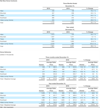 During the fourth quarter, the company improved its net home building debt to net capital to 45.2%, down 680 basis points from 52.0% at the end of 2018 and 860 basis points from 53.8% at the end of the third quarter.