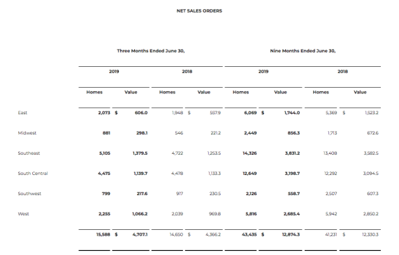 Net sales orders for the third quarter ended June 30, 2019 increased 6% to 15,588 homes and 8% in value to $4.7 billion compared to 14,650 homes and $4.4 billion in the same quarter of the prior year. The company’s cancellation rate (cancelled sales orders divided by gross sales orders) for the third quarter of fiscal 2019 was 20% compared to 21% in the prior year quarter. Net sales orders for the first nine months of fiscal 2019 increased 5% to 43,435 homes and 4% in value to $12.9 billion compared to 41,231 homes and $12.3 billion in the same period of fiscal 2018.