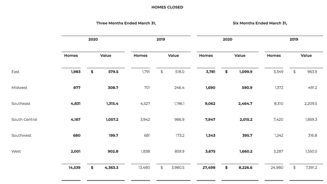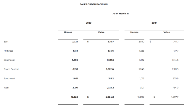 The company’s sales order backlog of homes under contract at March 31, 2020 increased 14% to 19,328 homes and 18% in value to $5.9 billion compared to 16,890 homes and $5.0 billion at March 31, 2019.
