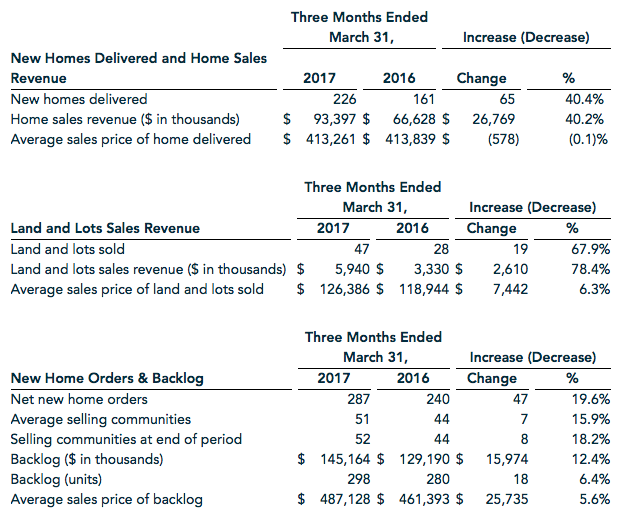 Builder operations revenue for the three months ended March 31, 2017 was $93.4 million, an increase of 40.2%, compared to $66.6 million for the three months ended March 31, 2016. Land development revenue for the three months ended March 31, 2017 was $5.9 million, an increase of 78.4%, compared to $3.3 million for the three months ended March 31, 2016.