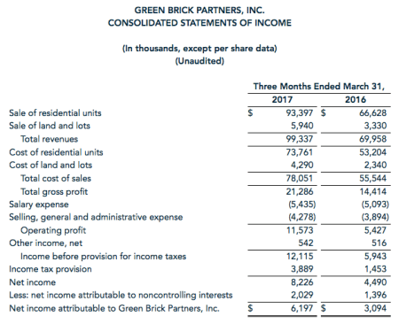 Green Brick Partners, Inc., Plano, Tex. (NASDAQ: GRBK) after market close Monday reported net income of $6.2 million, or $0.13 per share, for first quarter ended March 31, 2017. The gain compares with a profit of $3.1 million ($0.06 per share) in the comparable quarter last year. Analysts were expecting a profit of $0.10 per share.