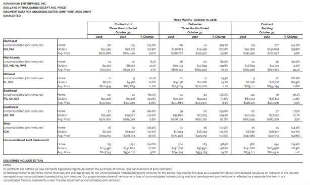 For the quarter ended October 31, 2018, deliveries, including unconsolidated joint ventures, increased 2.4% to 1,829 homes compared with 1,787 homes during the fourth quarter of fiscal 2017. Consolidated deliveries were 1,465 homes for the fourth quarter of fiscal 2018, an 8.7% decrease compared with 1,604 homes during the same quarter a year ago.