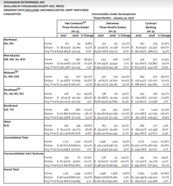 Total revenue was $552.0 million in the quarter, a decrease of 4.1% compared with $575.6 million in the first quarter of fiscal 2016. Deliveries, including unconsolidated joint ventures, decreased 4.6% to 1,398 homes compared with 1,466 homes during the first quarter of fiscal 2016. Consolidated deliveries were 1,290 homes for the first quarter of fiscal 2017, a 9.3% decrease compared with 1,422 homes during the same quarter a year ago.