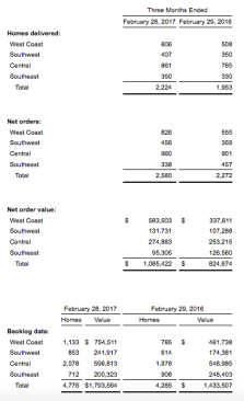 KB Home (NYSE: KBH) after market close Thursday reported net income of $14.3 million, or $0.15 per share, for its first quarter ended February 28, 2017. The gain compares with a profit of $13.1 million in the prior year quarter. Analysts were expecting a gain of 13 cents a share.