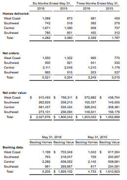 - Inventories totaled $3.53 billion, with investments in land acquisition and development totaling $702.6 million for the six months ended May 31, 2016.