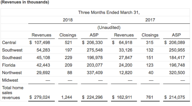 Home sales revenues for the first quarter of 2018 were $279.0 million, an increase of $116.1 million, or 71.3% over the first quarter of 2017. The increase in home sales revenues is due to both the increase in the number of homes closed and an increase in the average home sales price.