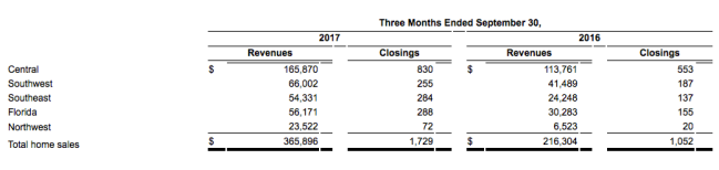 Ending backlog increased 70.9% to 1,328 units. Active Selling Communities at September 30, 2017 increased to 77 from 59. The company held 37,063 owned and controlled lots at the end of the quarter.