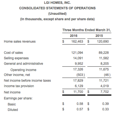 THE WOODLANDS, Texas, May 10, 2016 — LGI Homes, Inc. (Nasdaq:LGIH) on Tuesday reported a profit of $11.7 million, or $0.57 per share, for the first quarter ended March 31. That compares with a gain of $7.7 million for the comparable quarter last year, a 51.9% increase.