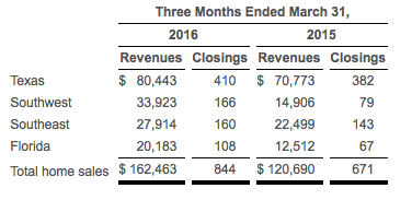 Closings increased 25.8% to 844 from 671 during the quarter, while active selling communities increased to 56 from 44 at the end of the first quarter of 2015. Home sales revenue was $162.5 million, an increase of $41.8 million, or 34.6%, from the first quarter of 2015.