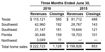Among the metrics reported for the quarter vs. last year’s quarter: Home closings increased 32.2% to 1,128 homes, home sales revenues increased 40.2% to $222.7 million, the average home sales price increased 6.0% to $197,450, gross margin as a percentage of home sales revenues was 26.5% as compared to 26.8%, active selling communities at quarter-end increased to 56 from 45 and total owned and controlled lots increased to 28,040 lots.