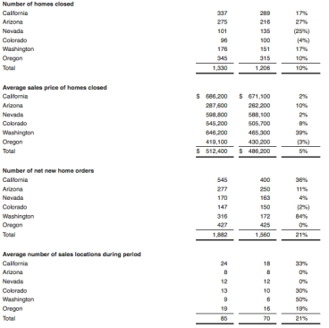 Net new home orders were 1,017, up 17%, and dollar value of orders totaled $554.0 million, up 31%. Average sales locations were up 22% to 88, and the average sales price (ASP) of new homes delivered rose 4% to $508,600.