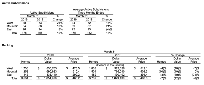 - Active subdivision count at March 31, 2019 of 178, up 15% year-over-year and 7% from December 31, 2018