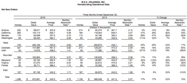 “Our order results included an increased contribution from our new, more affordable collection of home plans, which are still in the early stages of rollout,” said Larry A. Mizel, MDC chairman and CEO. “With a simpler design, these new plans should ultimately have a positive impact on our overall construction cycle times, which remain a key focus area for the company as we close out the year.”