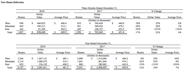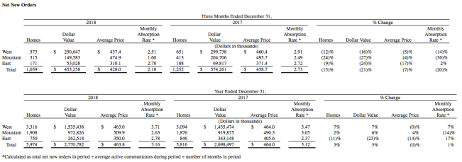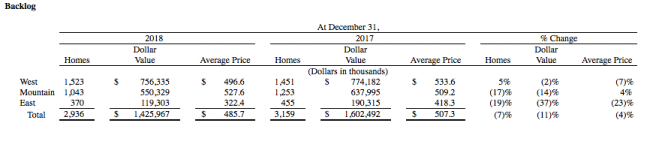 - Gross margin from home sales in backlog at 12/31/2018 comparable to 2018 full year closing gross margin (excluding impairments) of 19.0%