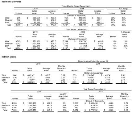 Mizel concluded, “As we enter 2020, we will continue to focus on the more affordable segments of the market due to the ongoing lack of supply and broad-based demand we have witnessed. We believe this favorable supply-demand environment will remain in place for some time given the demographic shifts occurring in this country. These factors, coupled with our solid market positioning and growing backlog, provided us with the confidence to increase our cash dividend by 10% just a few days ago.”