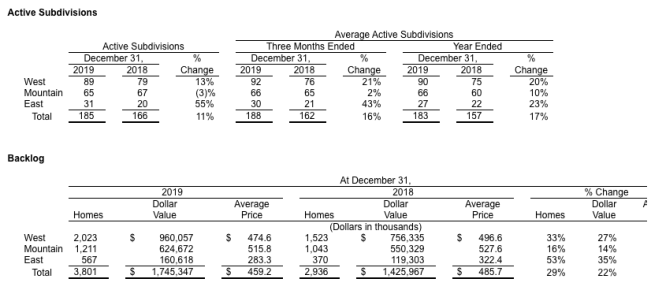 • Active subdivision count at December 31, 2019 of 185, up 11% year-over-year