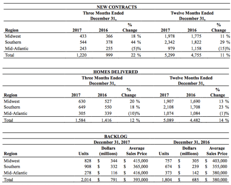 Robert H. Schottenstein, CEO and president, commented, “We had strong 2017 results highlighted by all-time company records for revenue, new contracts, and homes delivered. These records led us to a 25% increase in our 2017 net income, excluding the non-operating items. For the first time in our history, we exceeded 5,000 units in both homes delivered and new contracts while reaching nearly $2 billion in revenue. Importantly, our revenue and earnings growth resulted from strong performances in many of our home building divisions, combined with another record performance by our financial services business. We also reached our highest year-end backlog level in more than 10 years, with a sales value of $791 million – a 15% increase over 2016.”