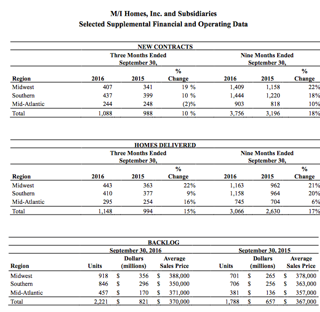 M/I Homes, Inc. (NYSE:MHO), Columbus, Ohio reported a profit of $10.9 million, or $0.35 per share, for the the third quarter ended September 30, 2016. The gain compares with a profit of $15.6 million, or $0.51 per diluted share, for the third quarter of 2015 and includes a $14.5 million pre-tax charge ($0.30 per share) for stucco-related repairs in Florida. Analysts were expecting a profit of $0.62 per share.