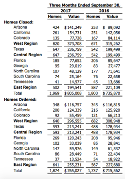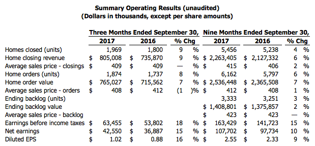 Regarding 4Q guideance, Hilton said, “Considering the results we’ve achieved in the first nine months of the year and adjusting for delays due to weather events, we are modestly reducing our closings and revenue guidance while maintaining our 2017 earnings expectations due to our strong third quarter performance. We expect to deliver approximately 7,600-7,800 homes and closing revenue of $3.15-3.25 billion for the year. On that level of closings and revenue, we are maintaining our expectations for approximately $235-245 million in pre-tax earnings with full year 2017 gross margin in line with 2016.”