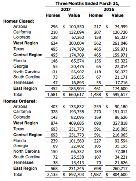 In addition to the 7% increase in orders, a 3% increase in average sales price (ASP) drove an 11% increase in the total value of orders. The increase in order value was led by robust growth in Arizona (+48%), California (+28%) and Texas (+17%), markets where Meritage has opened a large number of communities designed for entry-level and first-time buyers, which have been selling at a higher pace than traditional move-up communities. As a result of the beginning of a shift in those markets to entry level product, ASPs for the first quarter of 2017 were 5% lower in Arizona and 1% lower in Texas, compared to the first quarter of 2016.