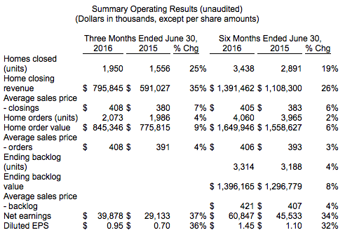 Meritage Homes Corp. (NYSE:MTH) on Thursday reported net earnings of $39.9 million ($0.95 per diluted share) for the second quarter of 2016, compared to prior year net earnings of $29.1 million ($0.70 per diluted share). The results beat analyst expectations for a profit of $0.80 per share.