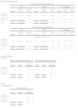 Net new home orders for the 2017 second quarter were up 53% to 98 homes, compared to 64 homes in the prior year period. The company’s monthly sales absorption pace was up significantly during the 2017 second quarter to 3.3 sales per average selling community compared to 1.9 in the prior year period. The improvement in the absorption rate was driven by order activity in both Southern and Northern California, with Northern California more than doubling its net orders over the prior year period. As a result of increased sales activity and the timing of opening new communities, quarter end selling communities were down 25% from the prior year, ending the 2017 second quarter with nine active communities compared to 12 as of the end of the prior year period. The company anticipates opening nine new communities in the second half of 2017.