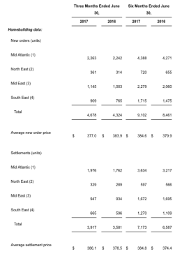 New orders in the second quarter of 2017 increased 8% to 4,678 units, when compared to 4,324 units in the second quarter of 2016. The average sales price of new orders in the second quarter of 2017 was $377,000, a decrease of 2% when compared with the second quarter of 2016. NVR attributed the decrease to a shift in new orders from higher priced markets to lower priced markets.
