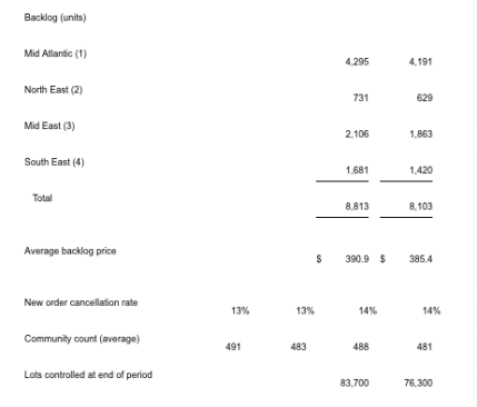 Settlements increased in the second quarter of 2017 to 3,917 units, 9% higher than the second quarter of 2016. The company’s backlog of homes sold but not settled as of June 30, 2017 increased on a unit basis by 9% to 8,813 units and increased on a dollar basis by 10% to $3,444,964,000when compared to June 30, 2016.