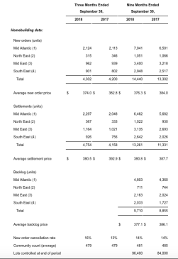 New orders in the third quarter of 2018 increased 2% to 4,302 units, when compared to 4,200 units in the third quarter of 2017. The average sales price of new orders in the third quarter of 2018 was $374,000, a decrease of 2% when compared with the third quarter of 2017. Settlements increased in the third quarter of 2018 to 4,754 units, 14% higher than the third quarter of 2017. The company’s backlog of homes sold but not settled as of September 30, 2018 increased on a unit basis by 10% to 9,710 units and increased on a dollar basis by 7% to $3,662,037,000 when compared to September 30, 2017.