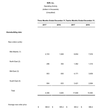 NVR, Inc., Reston, Va. (NYSE: NVR) on Thursday reported net income for its fourth quarter ended December 31, 2017 of $124,619,000, or $28.88 per diluted share, down from the same quarter last year by 17% and 24%, respectively. Wall Street was looking for a gain of $48.04. Shares were down 2.8% at $3,484.23 in early trading Wednesday.