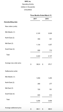 NVR Inc. (NYSE:NVR), Reston, reported Thursday net income for its first quarter ended March 31, 2017 of $102,923,000, or $25.12 per diluted share, up 58% and 59%, respectively, when compared to the 2016 first quarter of $65,303,000, or $15.79 per diluted share. Analysts were expecting a profit of $20.52 per share.