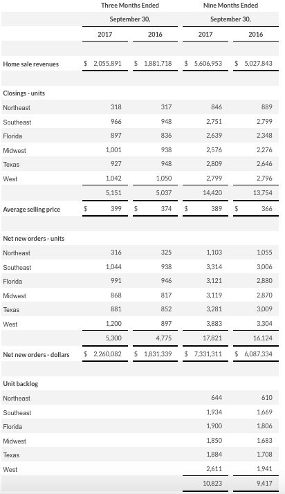 Net new orders for the third quarter increased 11% to 5,300 homes, while the value of new orders increased 23% over the prior year to $2.3 billion. The company operated out of 778 communities for the third quarter, which is up 10% over the third quarter of 2016.
