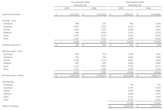 Unit backlog at the end of the quarter totaled 11,638 homes, which is up 4% over the third quarter of last year. Backlog value for the third quarter was $5.0 billion, which is an increase of 2% over the third quarter of 2018.