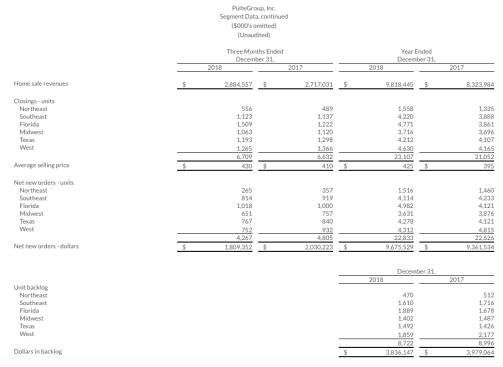 “The Company delivered strong financial results, but market conditions grew more challenging as 2018 progressed, with home buying demand softening in response to affordability challenges and general market uncertainty,” said Ryan Marshall, president and CEO of PulteGroup. “While continued strength in the economy, jobs and consumer confidence supports maintaining a positive long-term view on housing demand, we maintain our disciplined approach to the business that we believe will help us to better navigate today’s more volatile market conditions.”