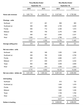 Home sale revenues for the third quarter of 2016 increased 29% over the prior year to $1.9 billion. Higher revenues for the period benefited from a 16% increase in deliveries to 5,037 homes and an 11%, or $37,000, increase in average selling price to $374,000.