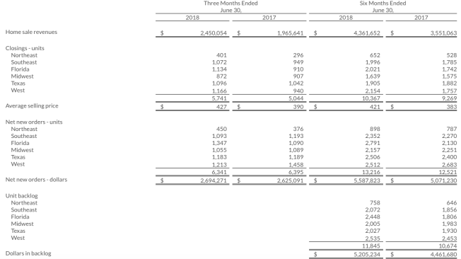 “Working against our defined strategic plan, our operating teams continue to do an outstanding job as revenues increased 25%, adjusted gross margin increased 60 basis points, and adjusted EPS surged 89%,” said Ryan Marshall, president and CEO of PulteGroup. “Given the operating and financial gains we have realized through the first half of 2018, and with almost 12,000 homes in backlog, we are well positioned to deliver outstanding full-year results.”