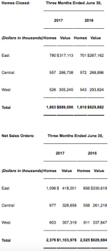 Home-building inventories were $3.2 billion at the end of the quarter, including 5,188 homes in inventory, compared to 4,607 homes in inventory at the end of the prior year quarter. Homes in inventory at the end of the quarter consisted of 3,333 sold units, 395 model homes and 1,460 inventory units, of which 259 were finished. The company owned or controlled approximately 38,500 lots at June 30, 2017, representing 5.0 years of supply and is focused on securing land for 2019 and beyond.