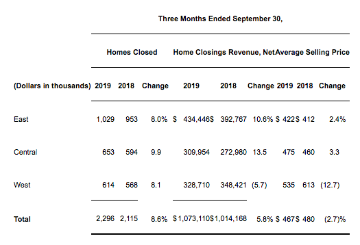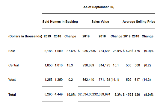 Average community count was 346, which resulted in an average monthly sales pace per community of 2.4 for the quarter. This compared to a sales pace of 2.2 in the third quarter of 2018. The company ended the quarter with 5,295 units in backlog, a year-over-year increase of 19%, with a sales value of approximately $2.5 billion.