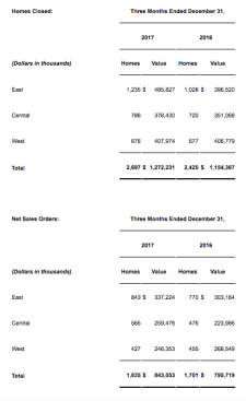 “Despite the challenges presented by Hurricanes Harvey and Irma in the third quarter, our impacted markets rebounded much quicker than initially thought on the active production units and other areas of the company over-performed resulting in us ending the year at the mid-point of our pre-hurricane closings guidance,” said Sheryl Palmer, chairman and CEO. “In fact, we met or exceeded most points of our initial 2017 guidance as well as our increased guidance after the second quarter.”