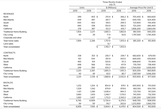 • Backlog value at third-quarter end was $5.84 billion, down 10%; units in backlog totaled 6,839, down 4%. The average price of homes in backlog was $854,500, compared to $912,600 at FY 2018’s third-quarter-end.