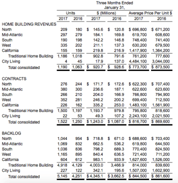 Net signed contracts of $1.24 billion and 1,522 units rose 14% in dollars and 22% in units, compared to FY 2016’s first quarter totals of $1.09 billion and 1,250 units. The average price of net signed contracts was $816,700, compared to $869,600 in FY 2016’s first quarter. The company said the decline was due in part to the acquisition of Boise-based Coleman Homes, a decline in the number of contracts signed in the City Living division compared to one year ago and an increase in townhome contracts in the North and Mid-Atlantic regions.
