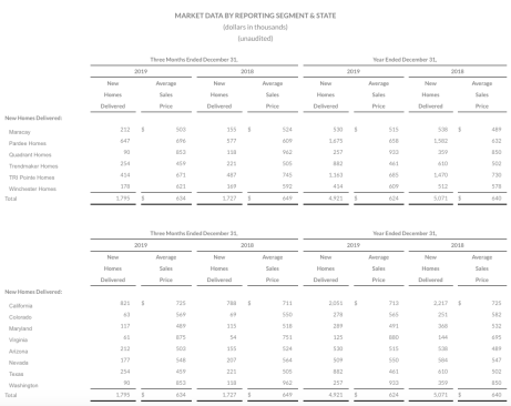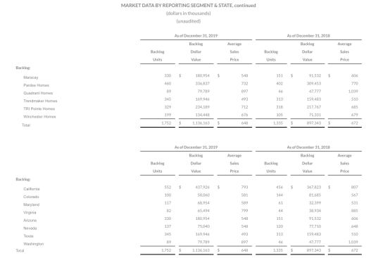 The company ended the quarter with 1,752 homes in backlog, representing approximately $1.1 billion. The average selling price of homes in backlog as of December 31, 2019 decreased $24,000, or 4%, to $648,000 compared to $672,000 at December 31, 2018.