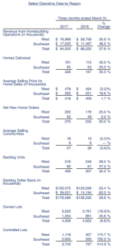 Total lots owned and controlled were 8,049, compared to 6,638 at December 31, 2016 attributable to an increase in controlled lots in the three Southeast markets and Pacific Northwest market as the company continues to prudently manage inventory and gain greater operating expense leverage in these rapidly growing divisions while striving to expand its return on equity and assets.