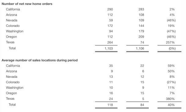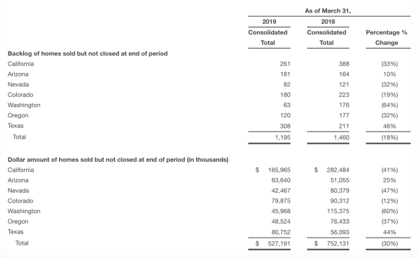 Home sales revenue for the first quarter of 2019 was $453.8 million, as compared to $372.4 million in the year-ago period, an increase of 22%. The increase was driven by a 28% increase in deliveries to 949 homes, compared to 740 in the first quarter of 2018, partially offset by a 5% year-over-year decline in the average sales price of homes closed. The decrease in ASP is based on a change in product mix with a higher concentration of deliveries from Texas.