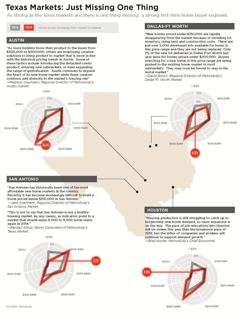 Metrostudy’s 1Q14 survey of the Texas Housing market shows even as housing continues to boom, new and lower income buyers are getting priced out of the market. Texas right now is home to the strongest housing markets in the entire country. Texas has been on a different cycle long before the boom and the bust came along. Driven by past swings in oil prices, the state was already on a rapid-growth trajectory before the rest of the country went on its early-2000s building binge. Said colloquially, when Phoenix and Las Vegas caught pneumonia, Houston sneezed and kept on going, right to the top of the national market list.